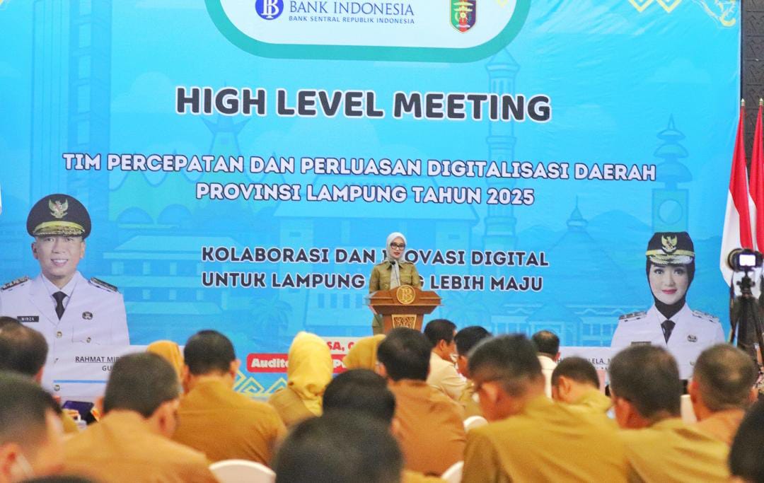 Bandarlampung, – Wakil Gubernur Jihan Nurlela membuka acara High Level Meeting Tim Percepatan dan Perluasan Digitalisasi Daerah (TP2DD) Provinsi Lampung Tahun 2025, di Auditorium Kantor Perwakilan Bank Indonesia Provinsi Lampung, Selasa (8/7/2025).