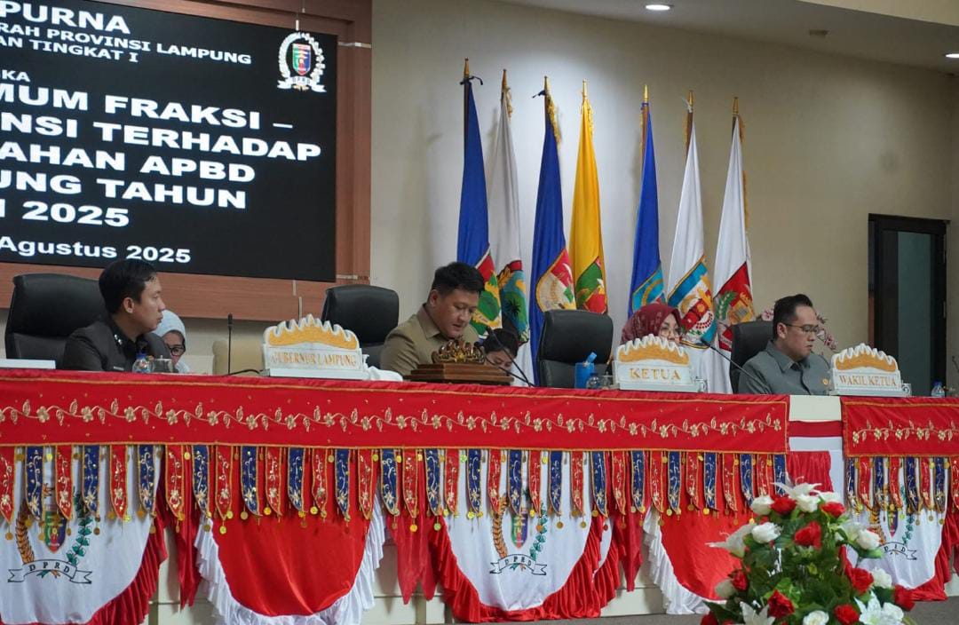 Bandarlampung, – Rapat Paripurna DPRD Provinsi Lampung lanjutan pembicaraan tingkat I terkait pemandangan umum fraksi-fraksi terhadap Raperda Perubahan APBD Tahun Anggaran 2025 digelar di Ruang Sidang Paripurna, Selasa (12/8/2025). Rapat yang dipimpin langsung oleh Ketua DPRD Provinsi Lampung, Ahmad Giri Akbar, membahas pandangan dan masukan dari delapan fraksi. Mayoritas fraksi menyetujui Raperda tersebut untuk dibahas ke tahap selanjutnya dengan sejumlah catatan strategis.