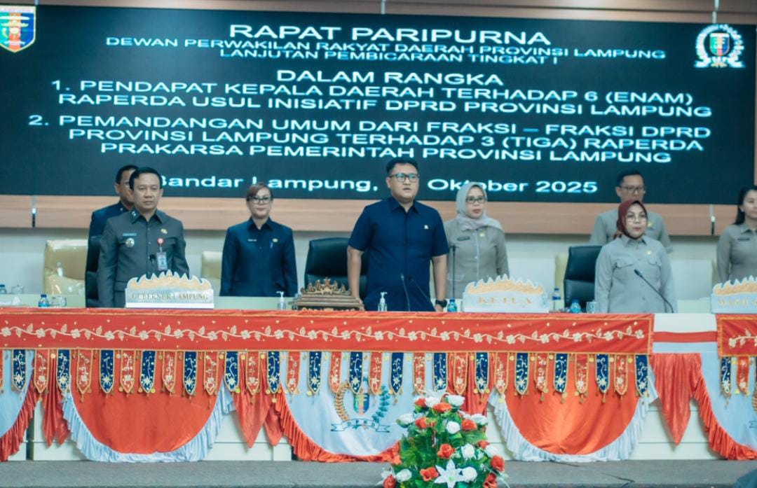 Bandarlampung, – Pemerintah Provinsi Lampung menyatakan setuju untuk melanjutkan pembahasan enam Rancangan Peraturan Daerah (Raperda) usul inisiatif Dewan Perwakilan Rakyat Daerah (DPRD) Provinsi Lampung pada Kamis (9/10/2025). Keenam Raperda tersebut meliputi Raperda tentang Percepatan Perizinan Usaha Pertambangan Mineral Bukan Logam, Perlindungan dan Pemberdayaan Petani, Penerapan Pola Pengelolaan Keuangan Badan Layanan Umum Daerah (BLUD), Pengendalian Kawasan Keselamatan Operasi Penerbangan Bandara Radin Inten II, Pengelolaan dan Penyelenggaraan Mutu Pendidikan, serta Penyelenggaraan Satu Data.