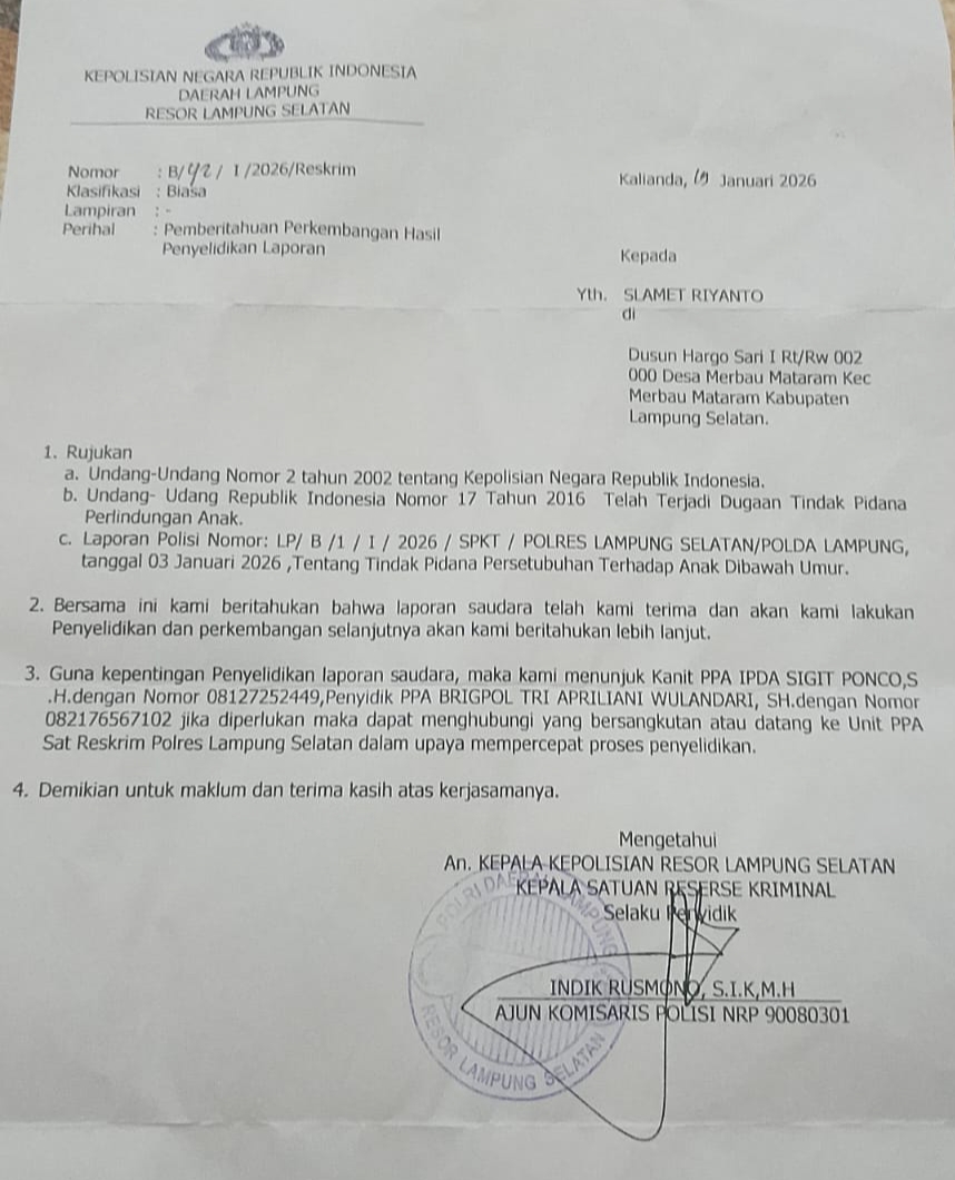 Laporan awal dibuat oleh ayah korban, SR, di Polsek Merbau Mataram. Setelah itu, pihak kepolisian mengarahkan keluarga untuk melanjutkan laporan ke Polres Lampung Selatan, agar kasus bisa ditindaklanjuti sesuai prosedur hukum yang berlaku.
